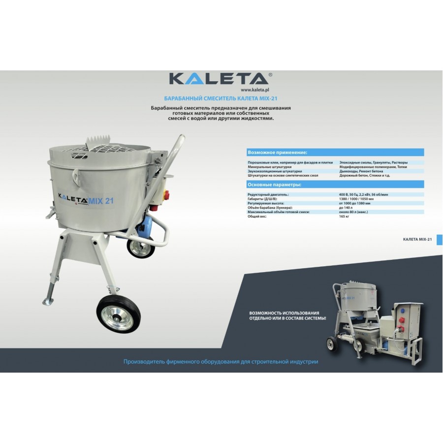 Барабанный смеситель KALETA MIX-21 предназначен для смешивания готовых материалов или собственных смесей с водой или другими жидкостями.